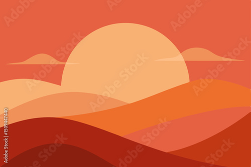 Orange sunset over a summer desert landscape with silhouetted camels and mountains