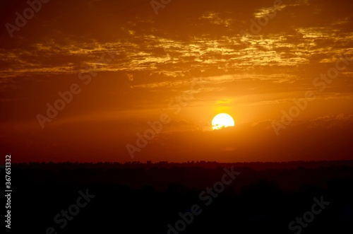 Orange sunset, sky, clouds. The white sun is set in a cloud.