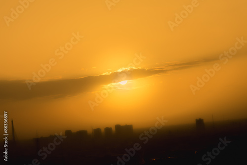 Orange sunset sky in urban with mist