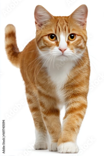 Orange tabby cat, with white markings on chest and face, walks forward against a clean, white background