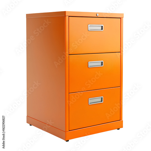 Orange three drawer metal filing cabinet isolated on transparent background