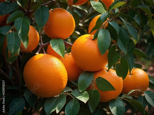 Orange trees with ripe fruits. Bloomy orange garden.