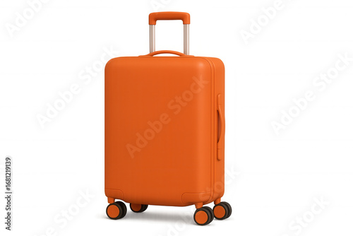 Orange trolley suitcase standing upright, prepared for travel, rendered in 3d against transparent backdrop