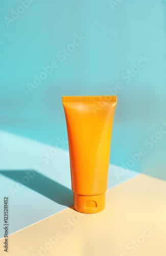 Orange tube of sunscreen on blue background. Summer sun protection concept. Product shot. Modern cosmetic package. Care for skin. Beautiful design. Travel vacation. Healthy lifestyle. Photo for