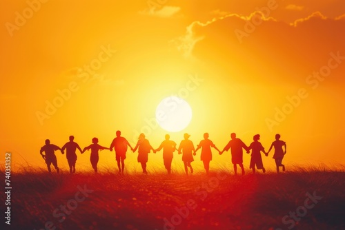 Orange-yellow silhouettes of a group of people holding hands running together in front of the board. Sunset background