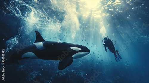 Orca Whale in the Ocean Underwater Background with Copy Space