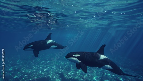 Orcas swimming in deep blue sea, majestic summer marine scene, travel