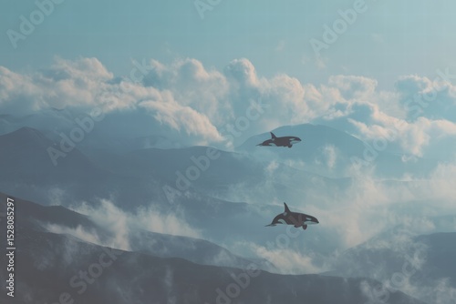 Orcas swimming through the sky above mountainous terrain, an unusual atmospheric phenomenon over the high mountains