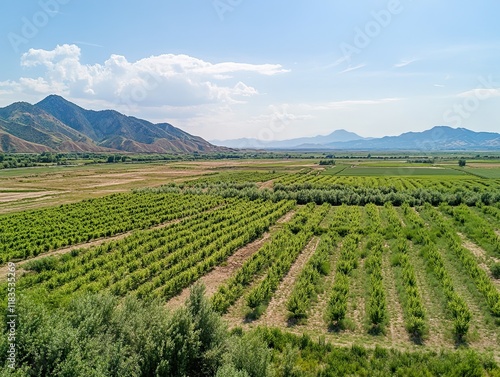 Orchard valley landscape, mountain backdrop, sunny day, agriculture.