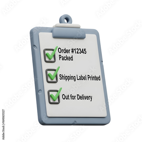 Order Tracking Checklist: 3D Rendering of a Clipboard Confirming Package Delivery Steps