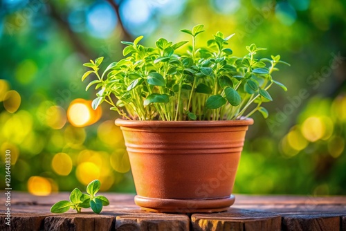 Oregano Seedlings in Terracotta Pot Against Garden Backdrop