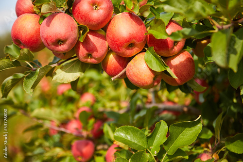 Organic apples hanging from a tree branch in an apple orchard