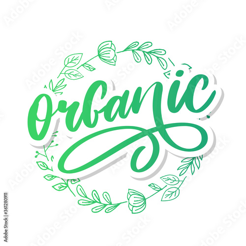 Organic brush lettering. Hand drawn word organic with green leaves. Label, logo template for organic products, healthy food markets.