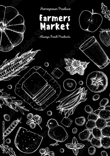 Organic food illustration. Farmers market design elements. Hand drawn sketch. Various food frame. Good food store concept.