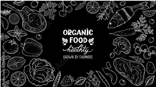 Organic food set. Healthy food frame vector illustration. Vegetables, fruits, meat sketch. Hand drawn vector illustration.