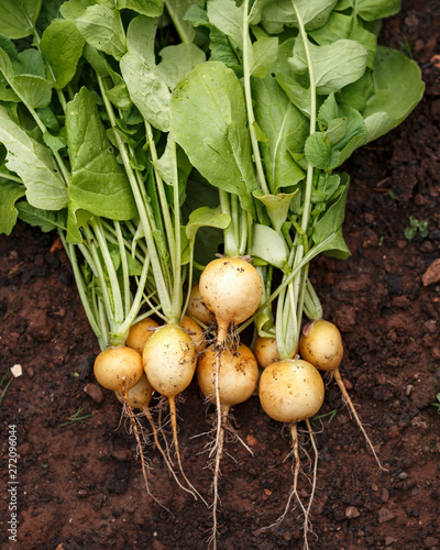 Organic freshly picked yellow skinned Zlata radish root vegetable