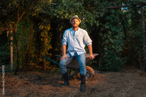 Organic gardening. Handsome adult caucasian bearded gardener in straw hat poses sitting on a cart. The concept of summer and harvesting