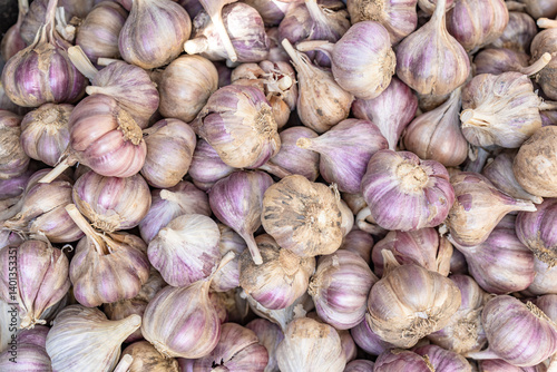 Organic garlic pile texture. Naturel garlic on market table closeup background.