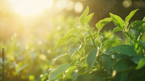 Organic green pepper plants thriving in sunlight on a farm showcasing healthy growth and vibrant foliage in a garden setting.