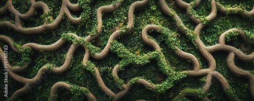 Organic growth creating a 3D labyrinth of vines and roots close up, maze-like, surreal, Composite, garden hedge maze