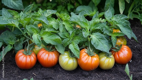 Organic Heirloom Tomatoes with Green Leaves and Dark Soil Background in Garden