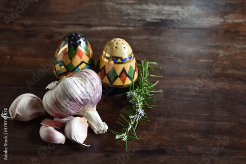 organic ingredients: fresh garlic and rosemary, ceramic salt shaker on rustic wooden table. Top view with space for text.