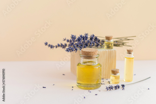 Organic lavender essential or aromatic oil in various glass vials. Dry flowers, wood, neutral natural tones. Place for your text. Natural cosmetics concept