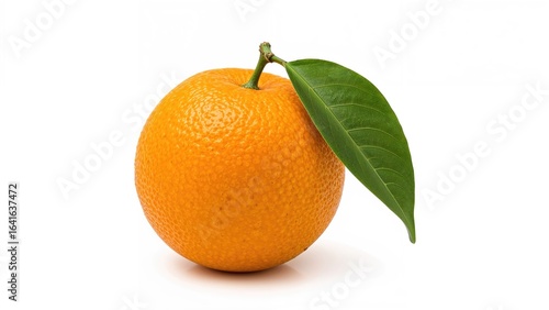 Organic orange fruit with attached leaves, displayed from side angle against a white backdrop