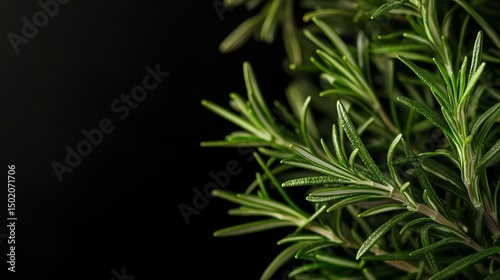 Organic rosemary oil and fresh leaves offer natural remedies. Ideal for hair and skin, and stress relief. The image shows the oil on a black background, leaving ample space for text.