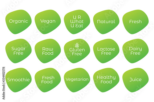 Organic, Vegan, Gluten Free, Natural, Fresh, Sugar, Raw, Lactose, Healthy Food, Smoothie, Juice, Vegetarian icons. Vector green set for design, product sticker, label, symbol, logo