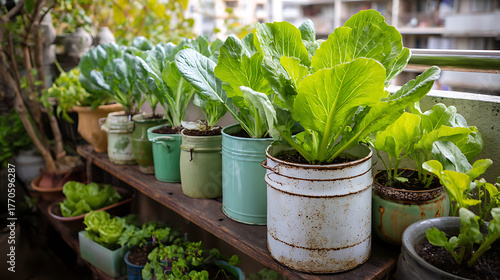 Organic vegetable container garden on apartment balcony, displaying a bright urban gardening aesthetic.