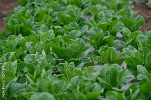 Organic vegetables. fresh cos lettuce in the farm. fresh organic cos lettuces vegetable. concept organic agriculture farm harvest in Thailand, South east Asia.