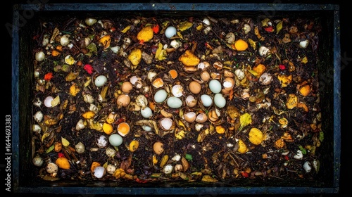 Organic waste composing a detailed arrangement of food scraps and eggshells in a compost bin.