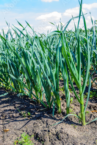 Organically grown leek plants in the field from close