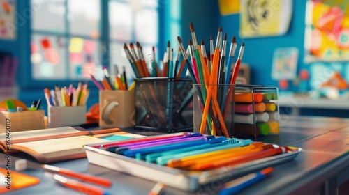 Organized artist's desk with a variety of supplies High quality images
