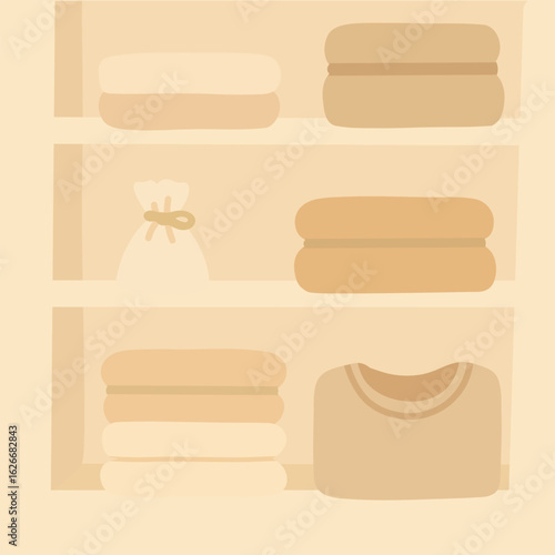 Organized closet with neatly folded clothes and a small scent sachet, in a clean and minimal pastel design.