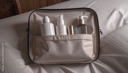 Organized cosmetic bag with various bottles and containers, resting on a bed.