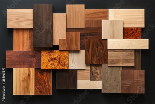 organized display of premium wood flooring samples arranged in geometric pattern showcasing varied grains and finishes with professional studio lighting