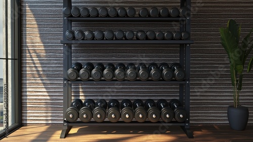 Organized dumbbell storage rack in a home gym