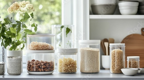 Organized kitchen countertop with clear food storage containers on a bright day.