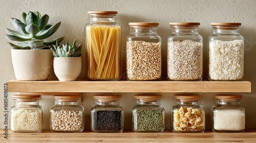 Organized Kitchen Shelf with Glass Jars and Succulent Plants