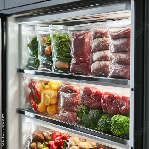 Organized refrigerator shelf with vacuum-sealed meat and fresh vegetables