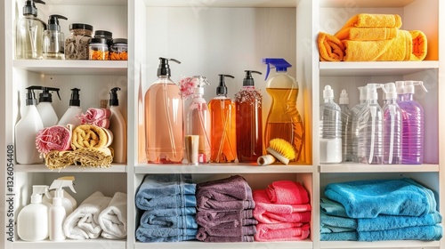 Organizing Cleaning Supplies and Towels on Neatly Arranged Shelves