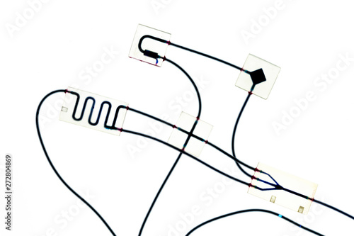 Organ-on-a-chip (OOC) - microfluidic device chip that simulates biological organs that is type of artificial organ. Prototype of design lab-on-a-chip in microfluidic laboratory