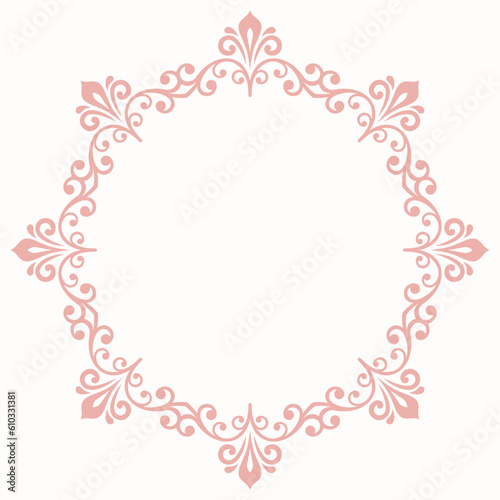 Oriental vector round frame with arabesques and floral elements. Floral round pink border with vintage pattern