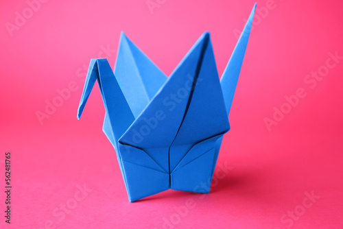 Origami art. Handmade paper crane on pink background, closeup
