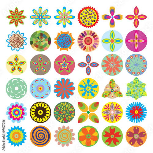 Ornament beautiful set of flowers like chakras for yoga. Geometric elements, hand drawn. Elements for spiritual compositions and patterns, small mandalas, kaleidoscope, medallion.