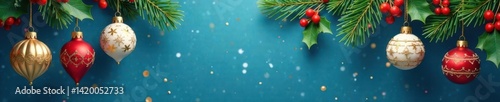 Ornament shapes hang from a blue background with festive holly and berries , ornaments, berries