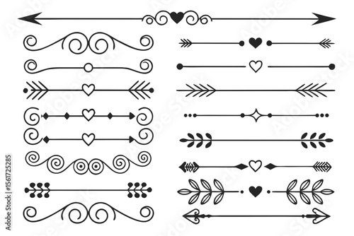 Ornamental Divider Elements in Black Vector Featuring Elegant Arrows, Floral Swirls, and Hand-Drawn Borders for Invitations and Graphic Design Layouts.