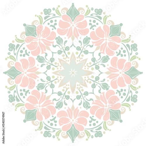 Ornamental Mandala with Flowers and Botanical Motifs on Black Backdrop